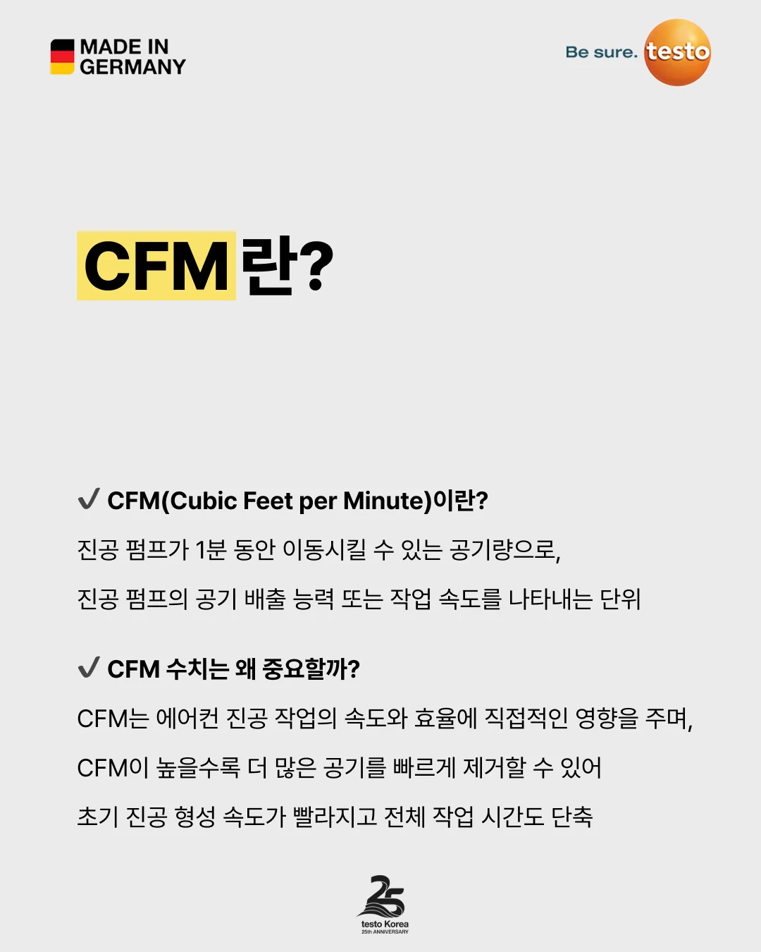 📌 핵심 요약 ✔ 진공 펌프는 배관 내부 압력을 낮춰 수분을 증발시켜 함께 배출하는 원리로 작동 ✔ CFM은 진공 펌프의 공기 배출 용량을 의미하며, 용량에 맞게 선택해야 진공 작업 효율을 높일 수 있음 ✔ testo 565i와 진공 프로브, 디지털 매니폴드 게이지를 함께 사용하면 데이터 기반의 진공 작업 관리 가능 |