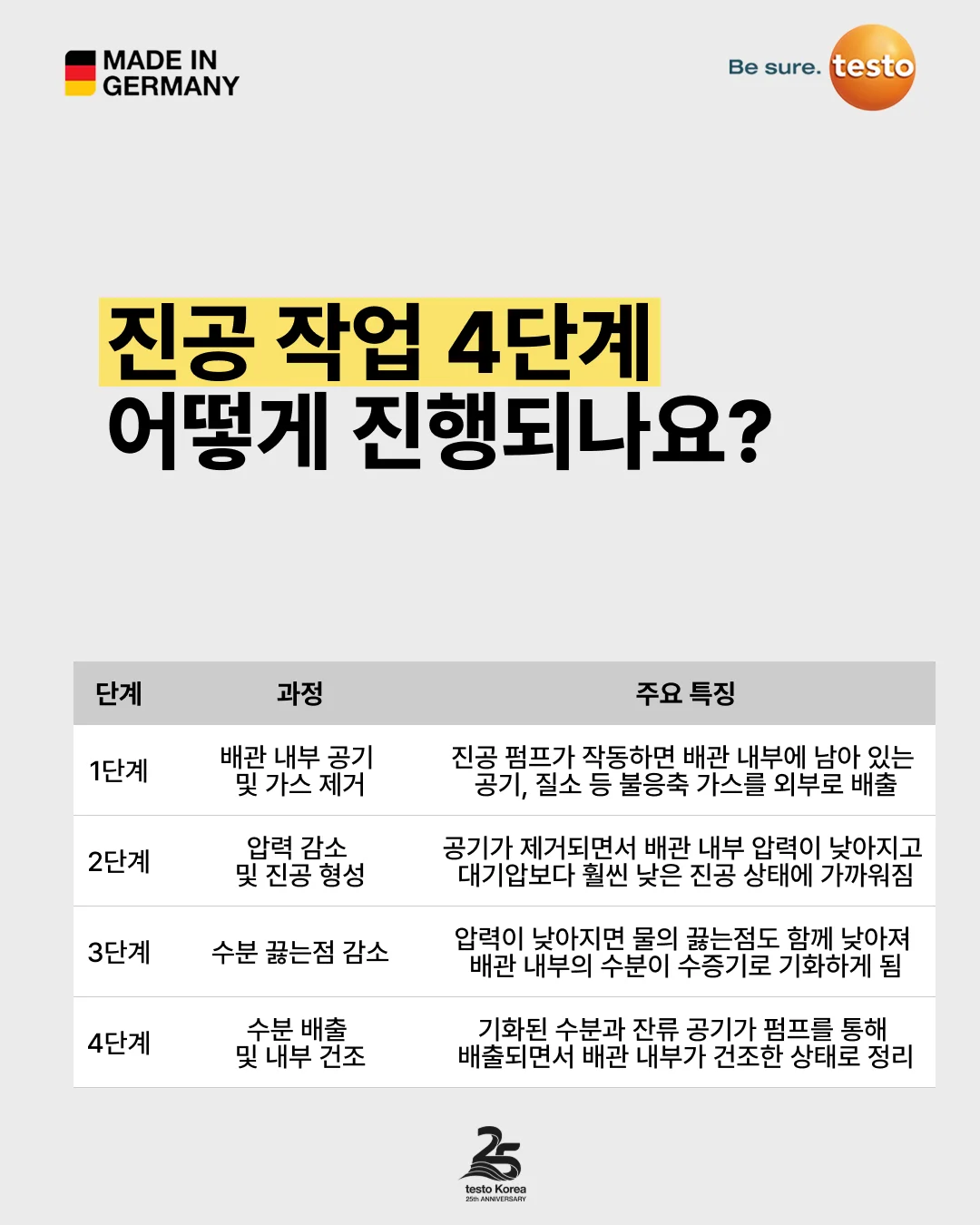 4단계 | 수분 배출 및 내부 건조 | 기화된 수분과 잔류 공기가 펌프를 통해 외부로 배출되면서 배관 내부가 점차 건조한 상태로 정리 |