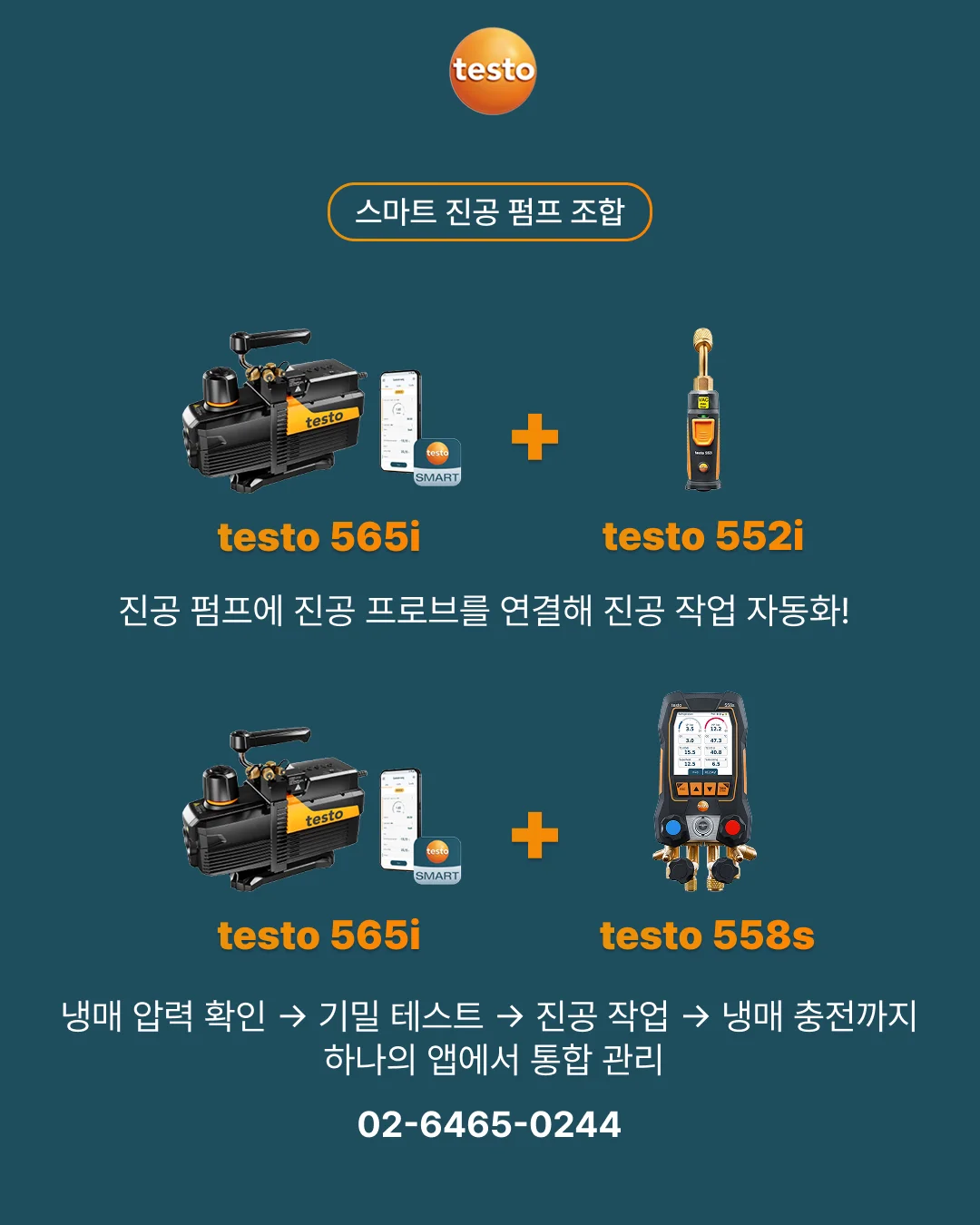 그렇다면 실제 냉동·공조 현장에서는 어떤 진공 펌프가 사용될까요? 다음 단락에서 테스토의 스마트 진공 펌프 testo 565i 두 가지 모델(7 CFM / 10 CFM)의 특징과 추천 사용 환경을 살펴보겠습니다.