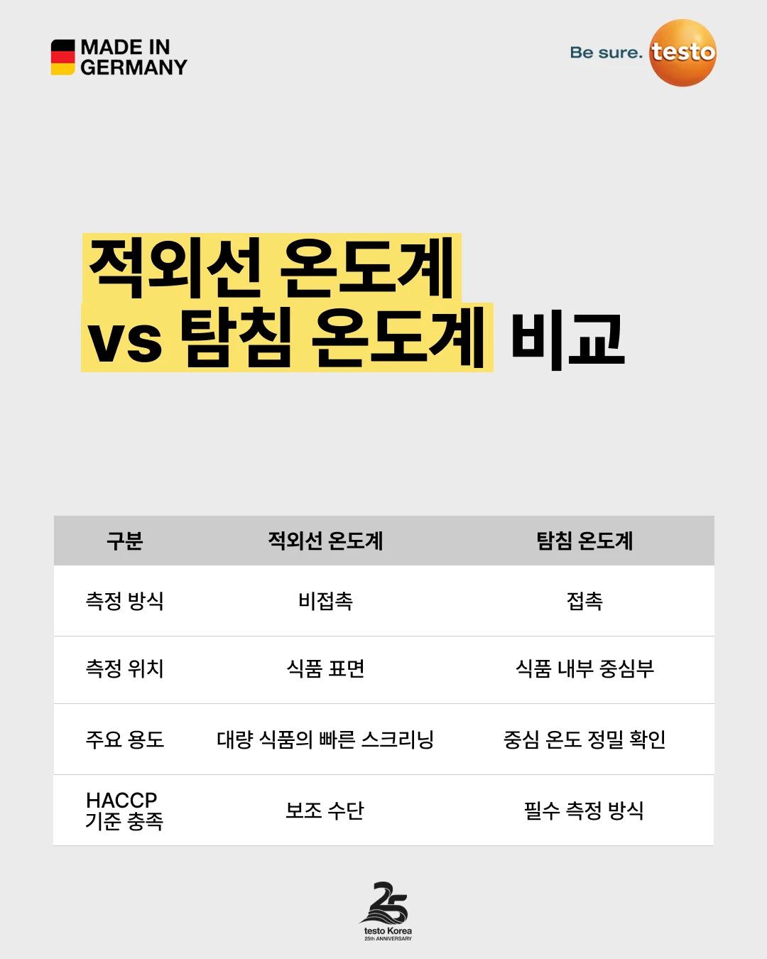 표면과 중심 온도를 구분해 관리하는 것이 기본입니다. 적외선 온도계로 표면 온도를 빠르게 점검하고, 식품 공정별 중심 온도 기준 충족 여부는 탐침 온도계로 중심부를 직접 측정해야 합니다. 이 방식이 HACCP에서 요구하는 관리 기준을 가장 효율적으로 충족하는 방법입니다.