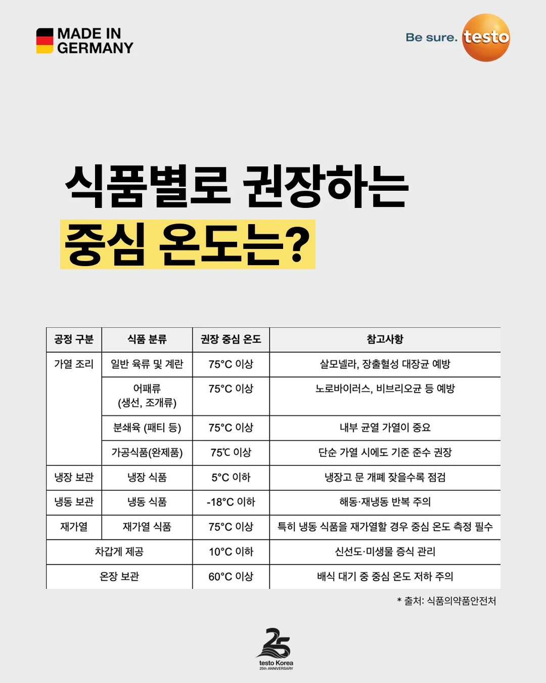 이 때문에 HACCP 기준에서도 가열·재가열·보관 공정의 판단 지표로 중심 온도 측정을 요구하고 있습니다.