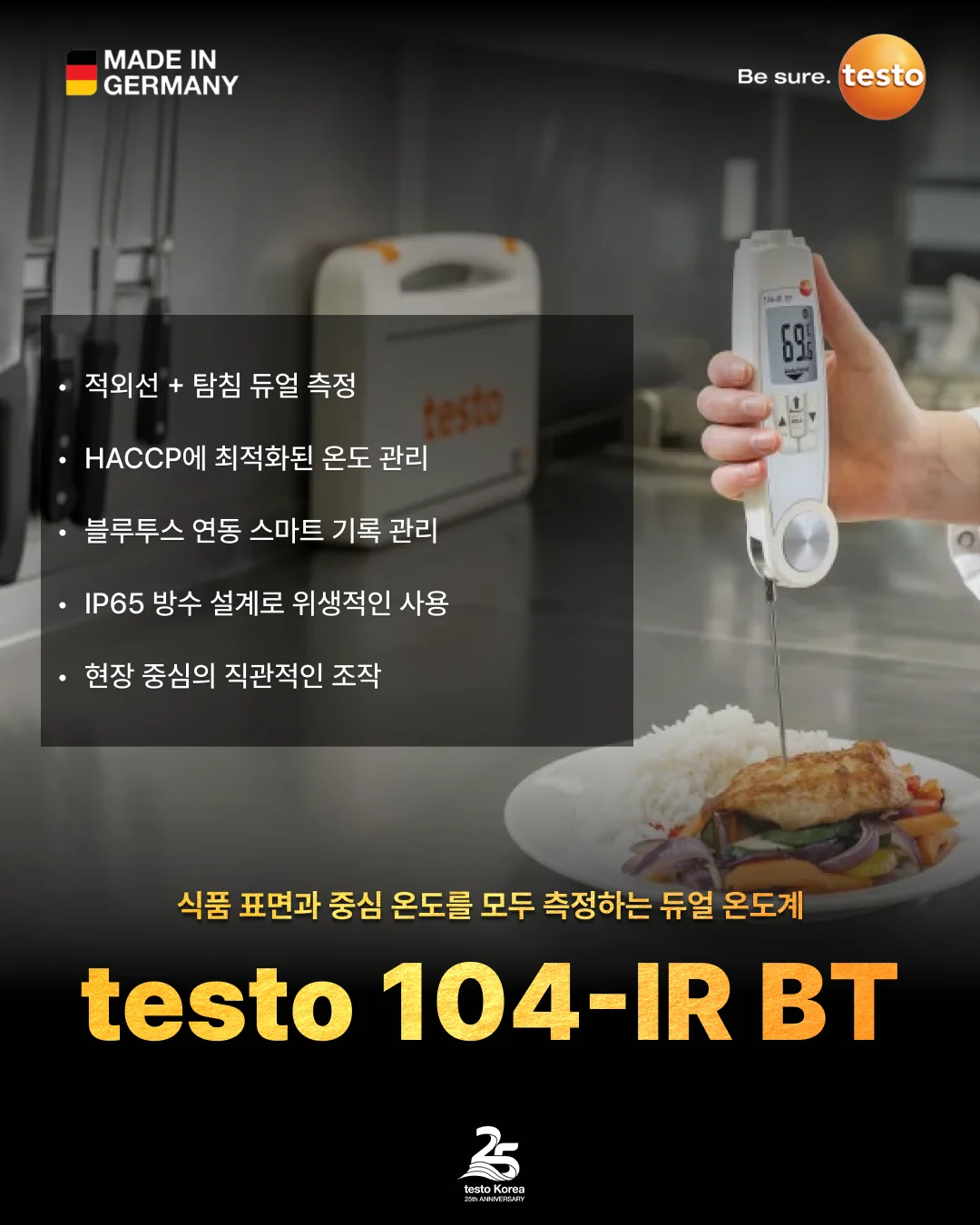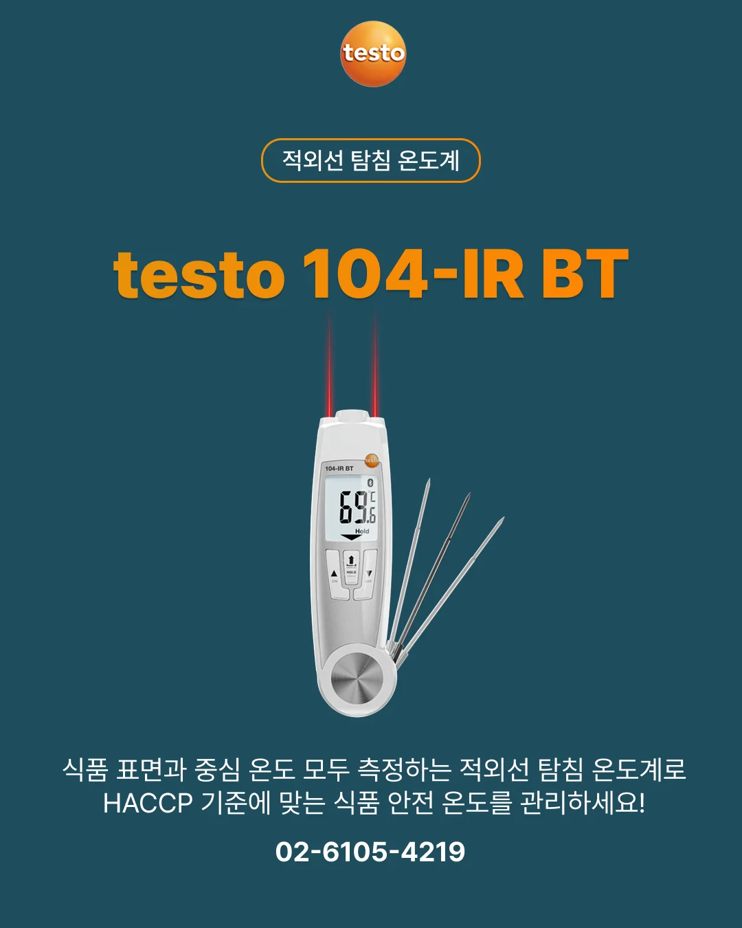 결국 식품 위생 관리를 위해 적외선 온도계와 탐침 온도계를 모두 갖춰야 하는데요. 표면과 중심 온도를 하나의 기기로 측정하는 듀얼 식품용 온도계를 활용하면 현장 효율은 크게 높아집니다. testo 104-IR BT는 표면 스캔과 중심 온도 측정을 동시에 지원하는 온도계로, HACCP 기준에 따른 식품 중심 온도 관리에 적합합니다.