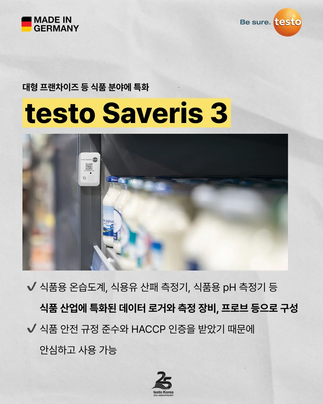 식품 산업에서 사용하는 장비는 HACCP 인증을 받는 것이 중요한데요. 테스토의 계측기는 식품 안전 규정 준수와 HACCP 인증을 받았기 때문에 안심하고 사용할 수 있습니다. 또한 testo Saveris 3는 여러 사업장에서 측정한 각종 데이터를 중앙(본사)에서 실시간 수집하고 통합 관리할 수 있어 Smart HACCP에도 적합합니다.