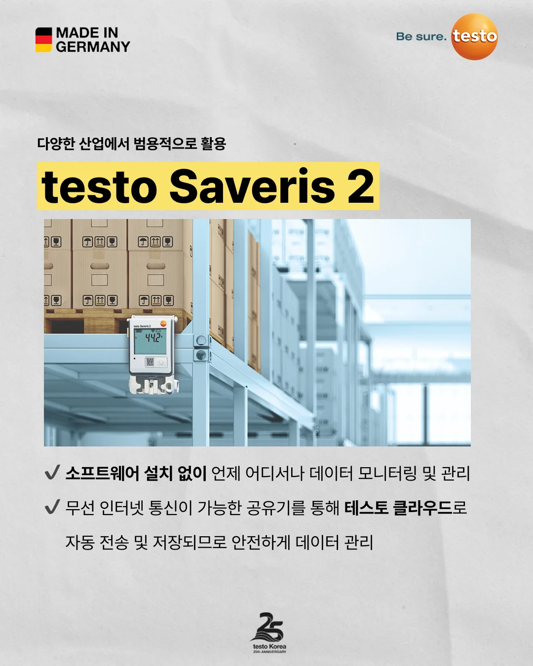 첫 번째로 소개하는 testo Saveris 1은 데이터 보안에 특화되어 있어 데이터 무결성이 중요한 제약 및 바이오 산업에 추천합니다.