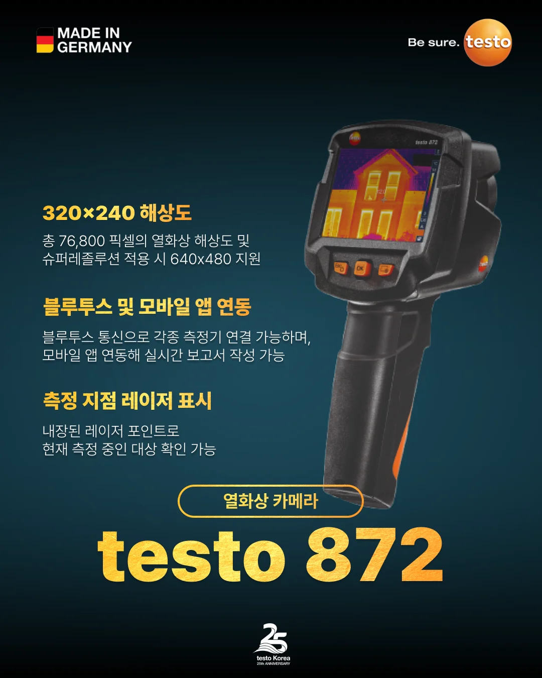 테스토의 열화상 카메라 testo 871은 240x180 픽셀의 열화상 해상도와 슈퍼레졸루션 기능을 지원하며, 블루투스 통신을 통해 온습도 측정기 등 여러 가지 측정기에 연결할 수 있고 모바일 앱에 연동해 실시간 열화상 보고서를 작성할 수 있습니다.