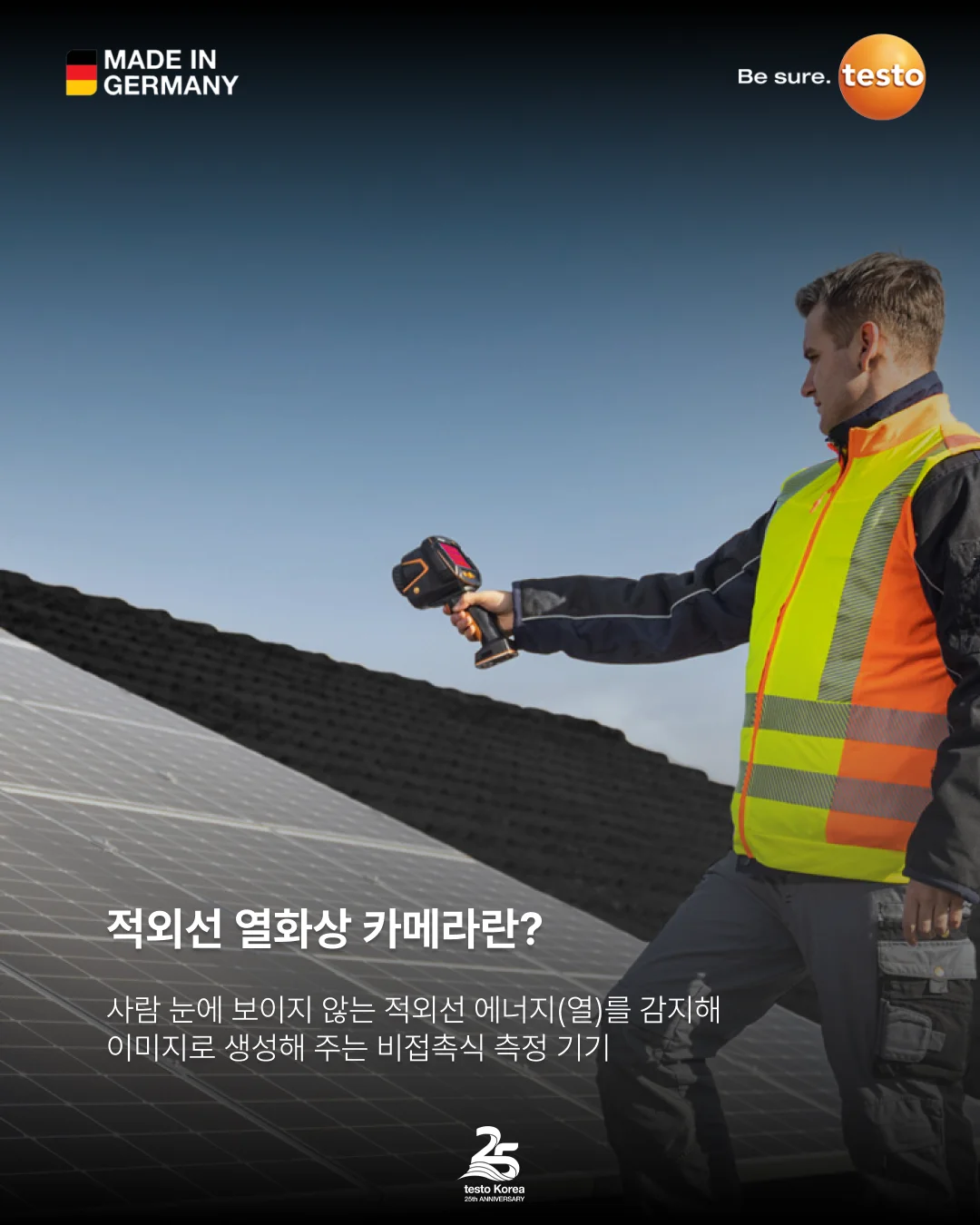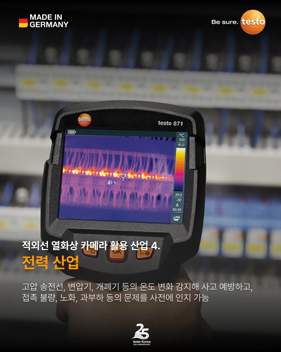 테스토는 입문자부터 전문가까지 다양한 분야에서 사용할 수 있는 적외선 열화상 카메라를 갖추고 있습니다. 테스토의 적외선 열화상 카메라는 높은 해상도와 섬세한 열 민감도, 쉽고 직관적인 작동 방법, 보고서 작성이 용이한 전용 한글 소프트웨어 등의 특장점이 있습니다.