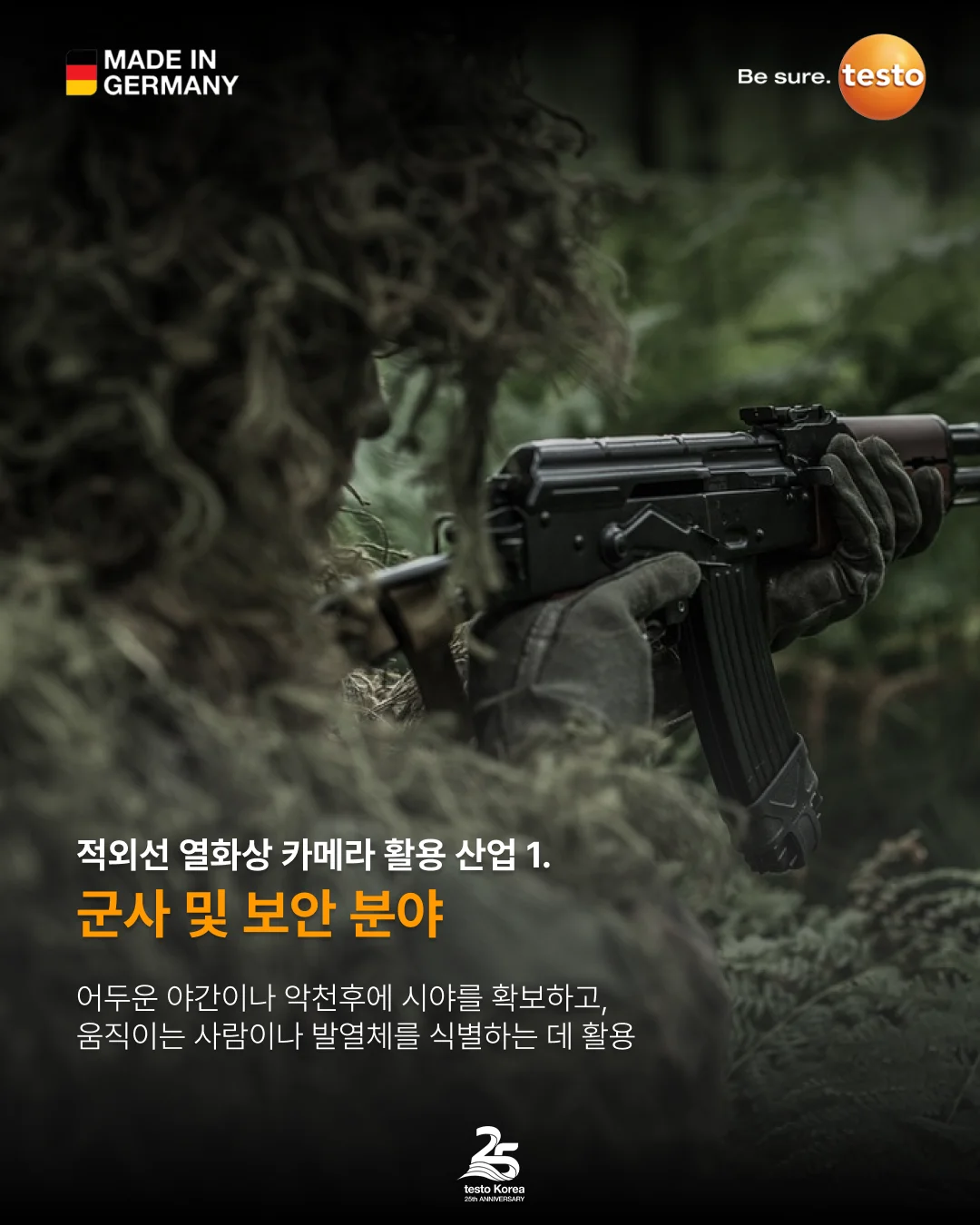 적외선 열화상 카메라는 최초에 군용으로 개발되었습니다. 어두운 야간이나 악천후에는 적외선을 통해 시야를 확보하고, 움직이는 사람이나 열을 발산하는 물질을 식별할 수 있기 때문입니다. 주로 야간 감시나 수색에 활용합니다.