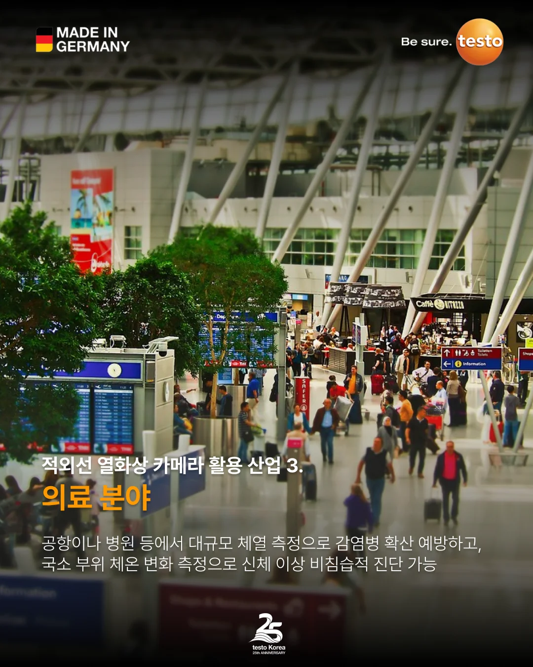 팬데믹 당시 열화상 카메라로 체열 측정한 경험 누구나 한 번쯤은 있으실 텐데요. 공항이나 병원, 공공기관에서 적외선 열화상 카메라를 활용하면 대규모 인원을 동시에 체열 측정하고 신속하게 대응할 수 있습니다. 또한 국소 부위 체온 변화를 측정해 염증이나 신체 이상 등을 비침습적으로 진단할 수 있으며, 수술 후 회복 정도를 모니터링하는 데에도 용이합니다.