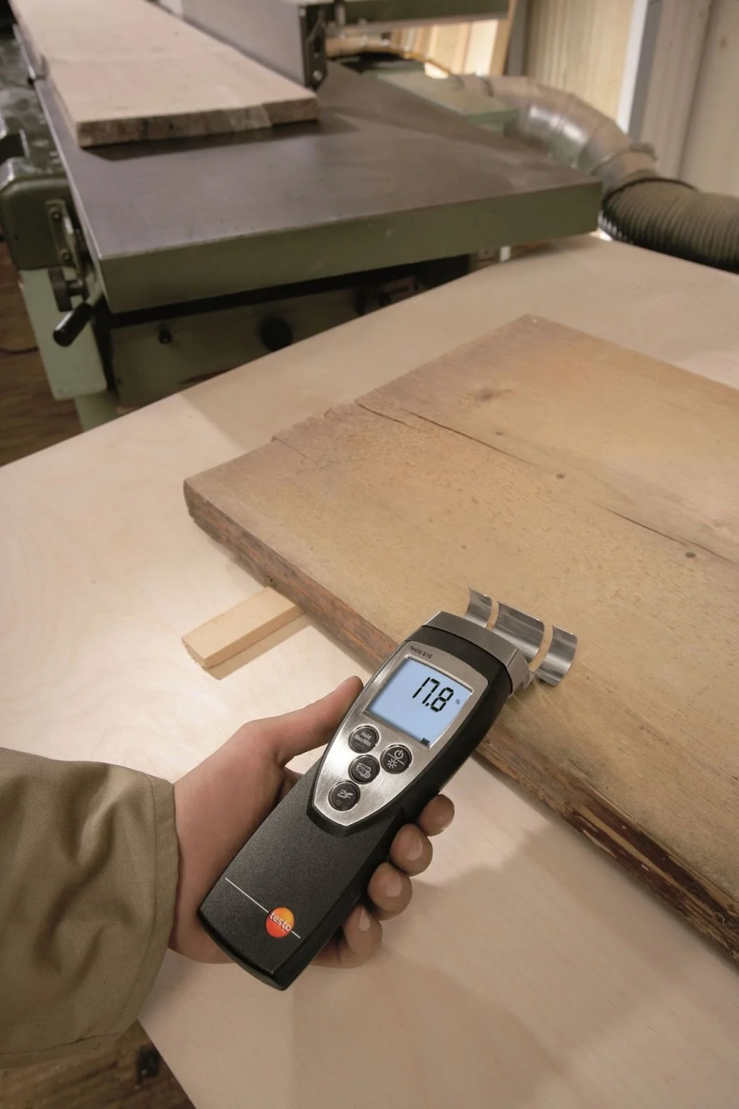 테스토의 testo 606은 나무, 시멘트 벽 등 다양한 재료의 수분 함량을 전문적으로 측정하는 재료 수분 측정기로, 목재 등 재료에 센서 핀이 완전히 밀착되도록 찔러 넣어 측정할 수 있습니다.