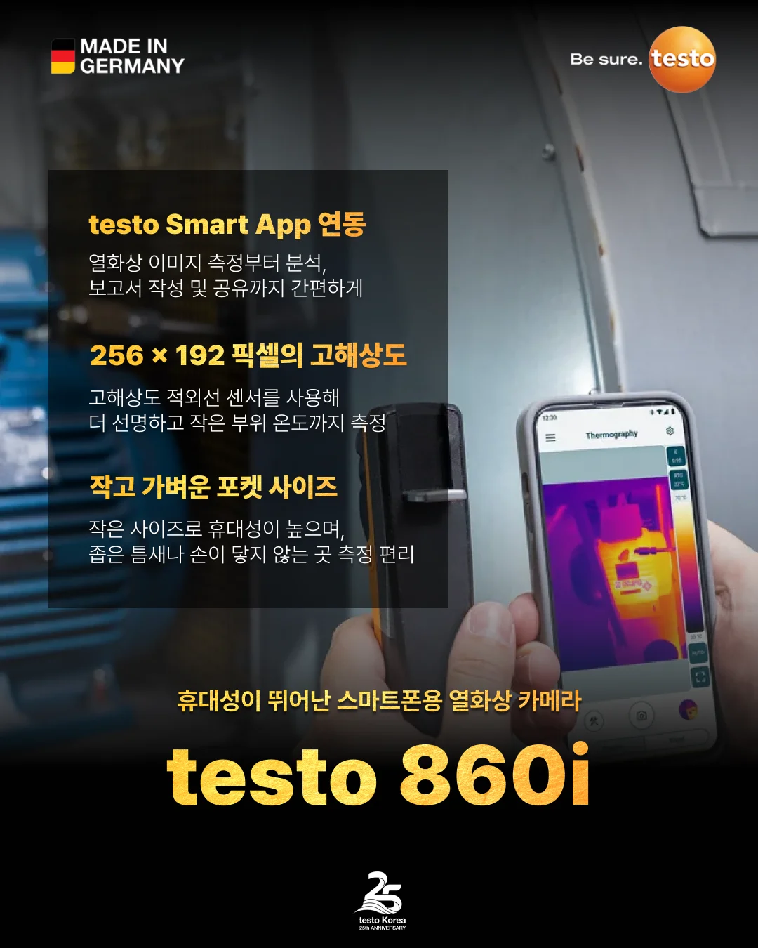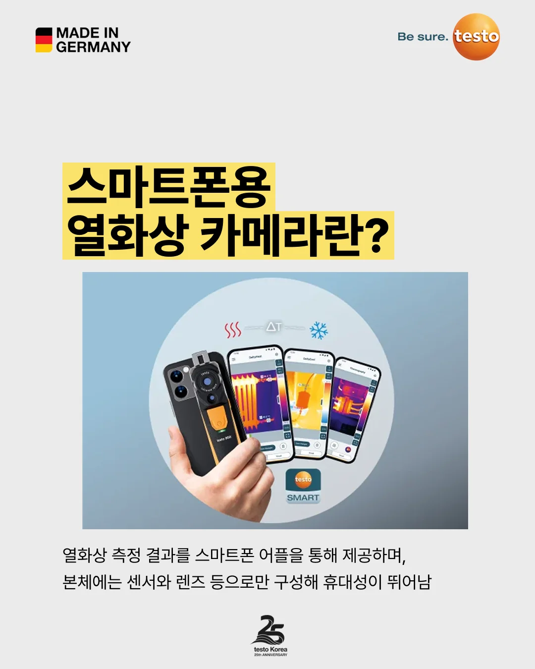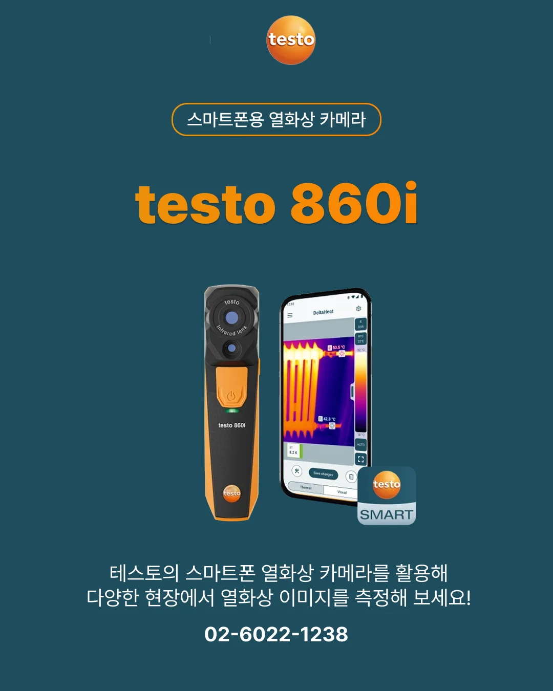 테스토의 스마트폰용 열화상 카메라 testo 860i는 스마트폰 어플과 연동해 열화상 이미지를 간편하게 측정할 수 있고, 고해상도 이미지를 제공하며, 휴대성이 높아 현장 이동이나 출장이 많은 직군에 추천해요.